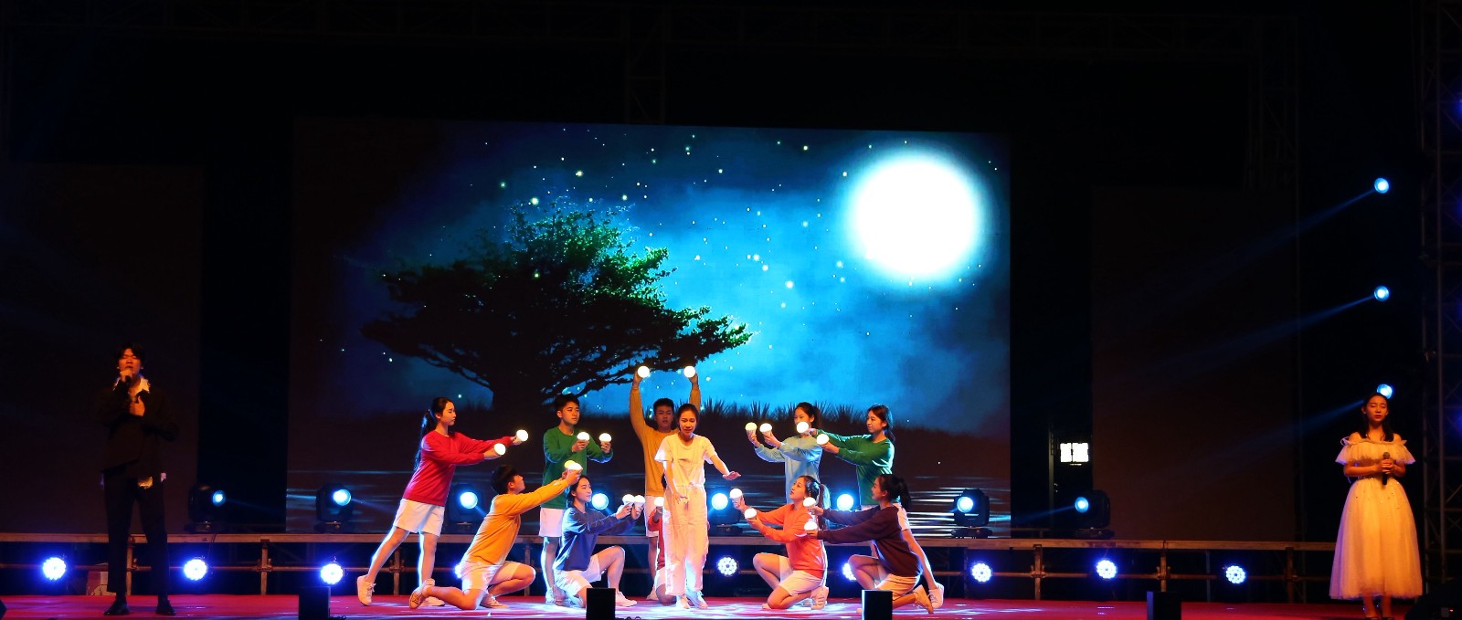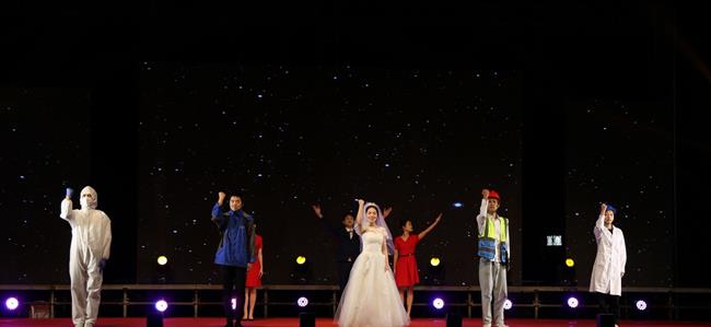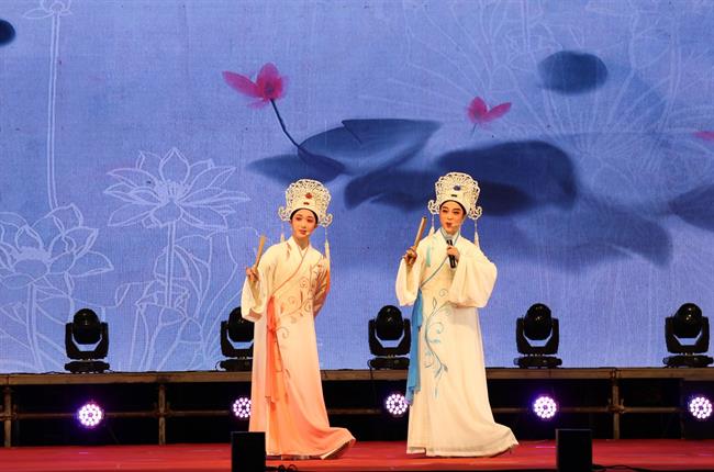 戏剧系表演艺术专业学生现场表演情景剧《江南小镇》、RAP《庆功酒》、小品《“摊”上事儿》、表演唱《小孩的星星》、朗诵《最美逆行者》、快板《别样风采看浙江》等。表演的音乐韵律感极强,舞蹈轻盈、富有诗意,如行云流水,美得令人窒息,目不暇接。同学们以多元艺术语汇,讲述精彩中国故事,礼赞新时代,颂扬新征程,细微动人的艺术表现深深感染了现场观众。戏曲学院学生表演的传统越剧折子戏《白蛇传·断桥》《梁祝·十八相送》《梁祝·回十八》深受当地民众的喜爱,同学们的唱功让当地群众惊叹。小品《“摊”上事儿》从小视角展现了“00后”的青春风采和精神风貌,观众直呼“真有味道!”