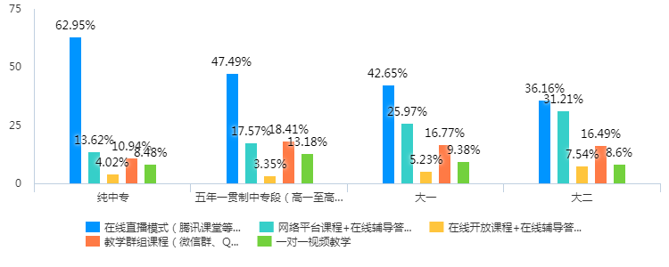 调查结果显示,直播课最受欢迎,慕课、精品在线开放课程等相对不被学生欢迎。这与艺术教育注重直观表达、实践比重大、强调互动反馈的要求密不可分。交叉分析显示,中专学生选择直播课的比例最高,大二学生对各个平台的选择相对较平均,这与中专生年龄较小,自主学习能力相对较弱,大二学生自主性较强等原因密切相关。