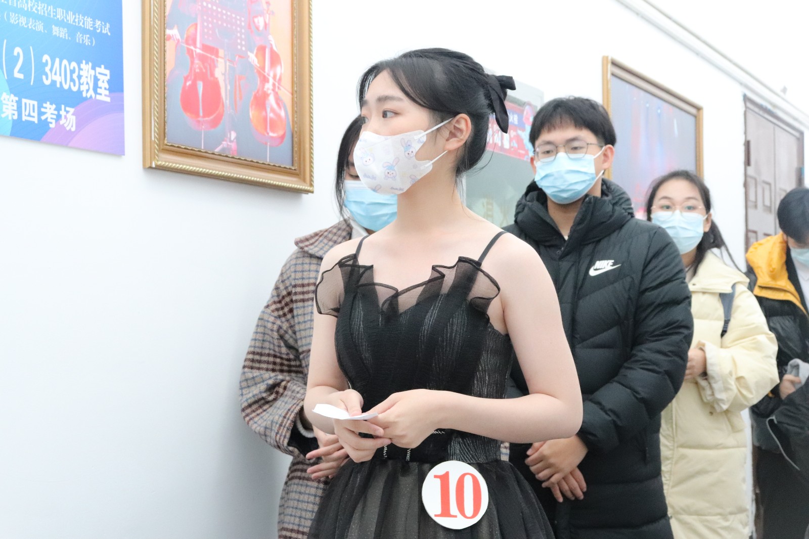 考生们在排队等候时的状态各有不同,或在候考室进行热身,或低头默记曲谱,或在一旁做深呼吸调整情绪。而在校外等候的家长也不轻松,有的家长频频望向校内,有的通过视频电话和其余在家中等候的家人们交流孩子的状况。