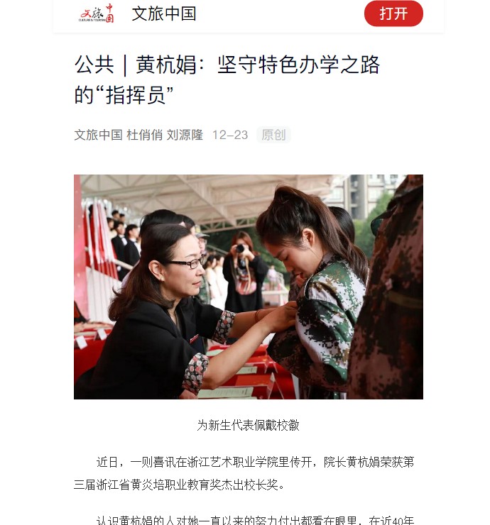 “每一位艺术大家、每一个艺术流派,都有自己独特的风格。对于学校而言,这个风格就是学校的特色。”黄杭娟说道。“特色”很重要,作为学校“指挥员”的黄杭娟,始终秉持大文化视野、特色化办学的理念,以最大的热情团结带领全校师生实施一系列“提质培优”行动计划,推进学校内涵建设,并取得了显著的成效。五年来,学校取得了一系列标志性成果:成为全国第一家增挂省级“公共文化管理学院”办学牌子的高校,入选教育部第三批现代学徒制试点单位,入选国家和省级高职“双高”计划,连续三届获得国家级教学成果奖,这背后都离不开黄杭娟的坚持与付出。