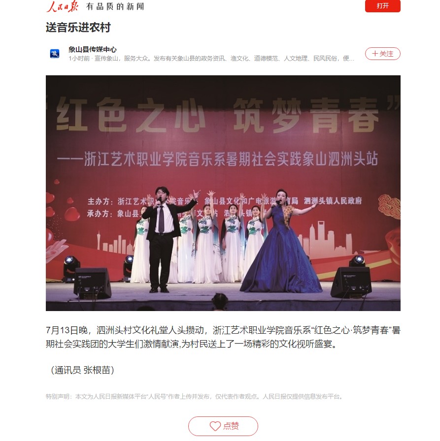 浙艺暑期社会实践活动得到人民日报、新华社等媒体广泛关注,新闻报道在人民日报客户端、新华社客户端陆续发布。
