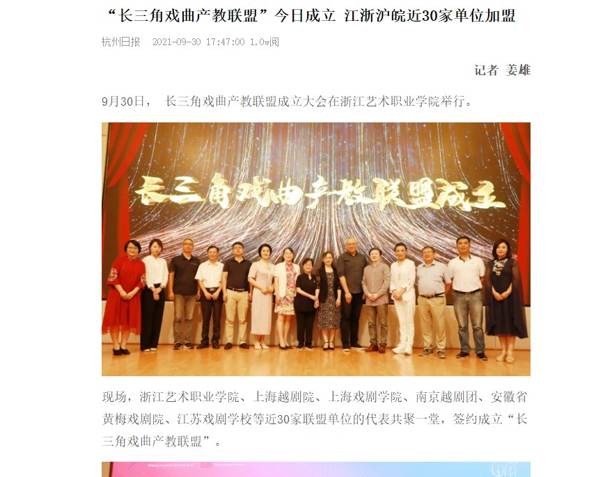 杭州日报:“长三角戏曲产教联盟”今日成立 江浙沪皖近30家单位加盟