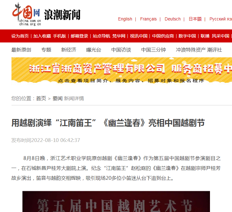 中国网浪潮新闻:用越剧演绎“江南笛王”《幽兰逢春》亮相中国越剧节