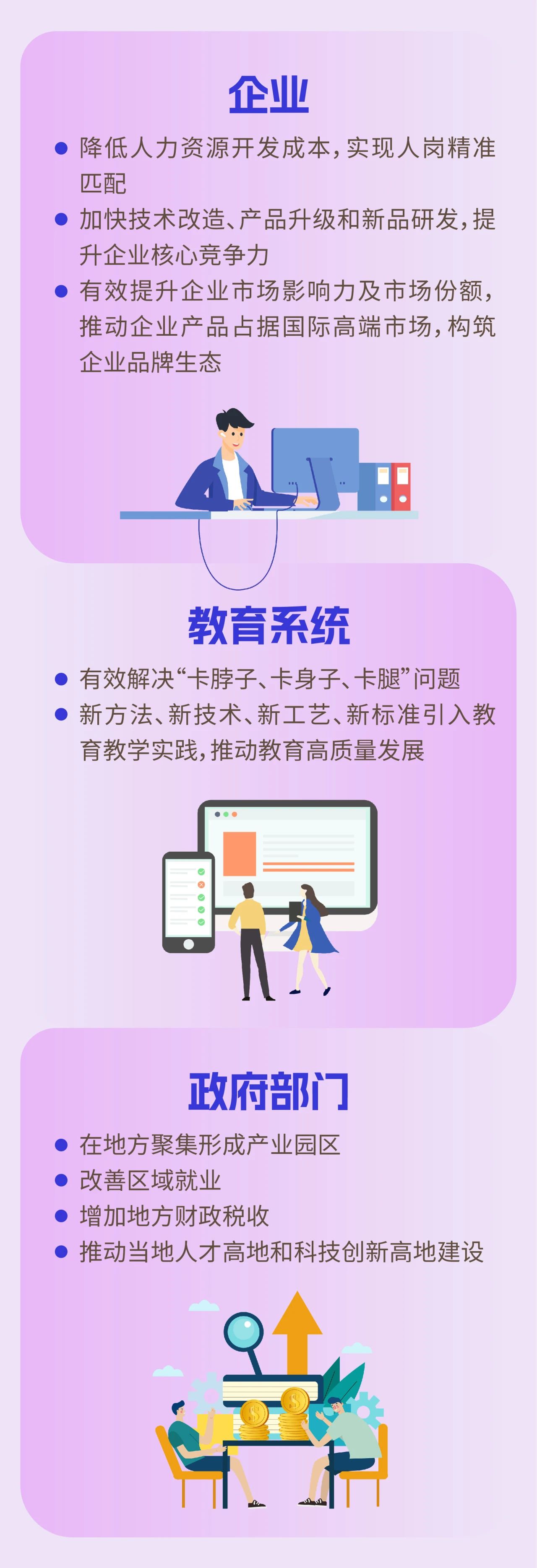 开展转化创新、技术创新和工艺创新项目,提升企业产品和服务的竞争力,推动行业新方法、新技术、新工艺、新标准反哺教育教学实践,产出一批“金专、金课、金师、金地、金教材”,源源不断为培养符合企业需要的各级各类人才。