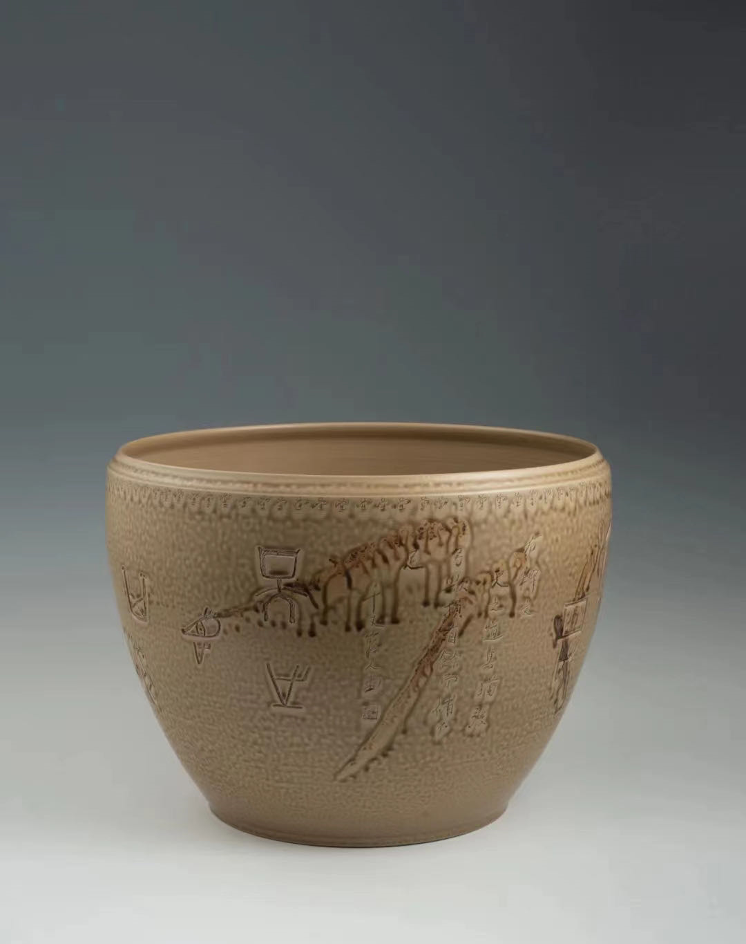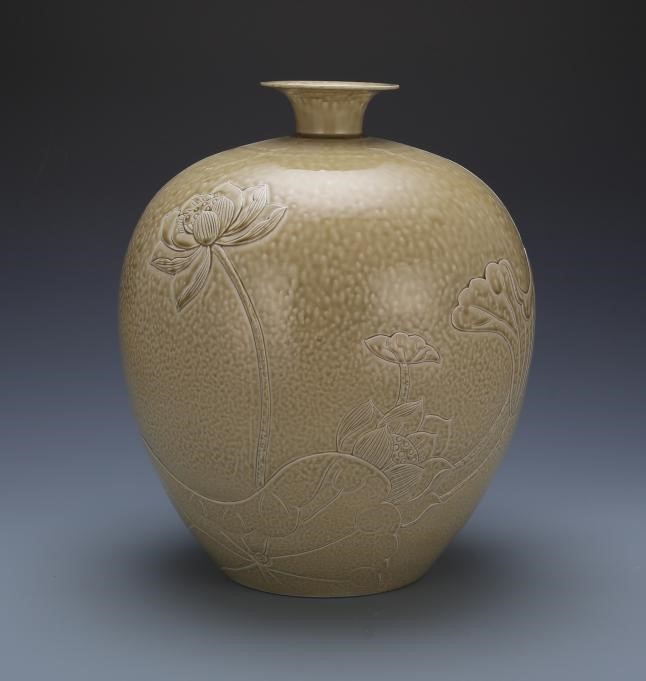 《灰釉刻花牡丹瓶》