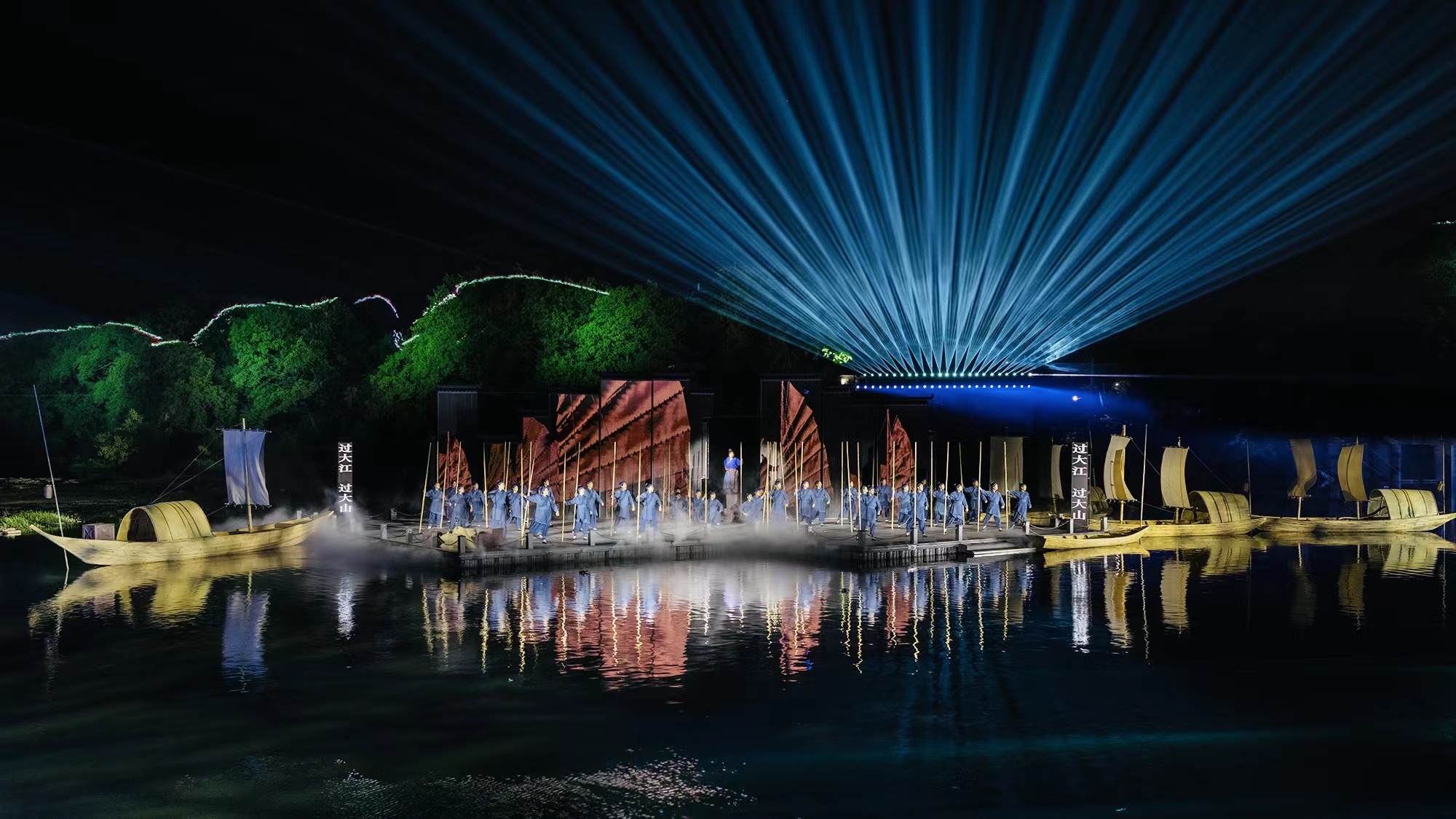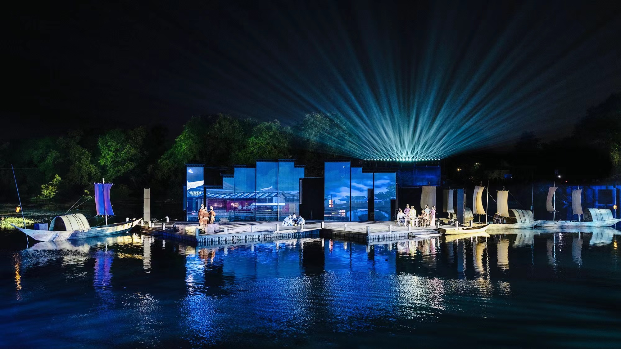 周正平一直对于艺术创作有独特的见解,被中国艺术界誉为“灯光诗人”。本次展览中,周正平的作品有越剧《红玉》和山水剧场《清溪江湖》。《红玉》的灯光设计融入舞美整体空间的韵律,又作为流动的画笔自成体系。在白色调的空灵布景中,使用和谐的色彩和精致的笔触,描绘出简约诗化的情境。在创造意象空间的表现手法上,运用富有张力和节奏感的光影,既刻画了表演动作,又强化了全女班演员在武戏上的阳刚气质。将繁复的技术手段和凝练的艺术构思隐藏在诗意画面背后,通过光形成视觉语汇,与观众进行情绪对话。在《清溪江湖》中,周正平让视觉艺术进入清湖古镇的整体公共空间,既是对沉睡着的江山文化的唤醒,也是他游走半生对故乡的献礼。