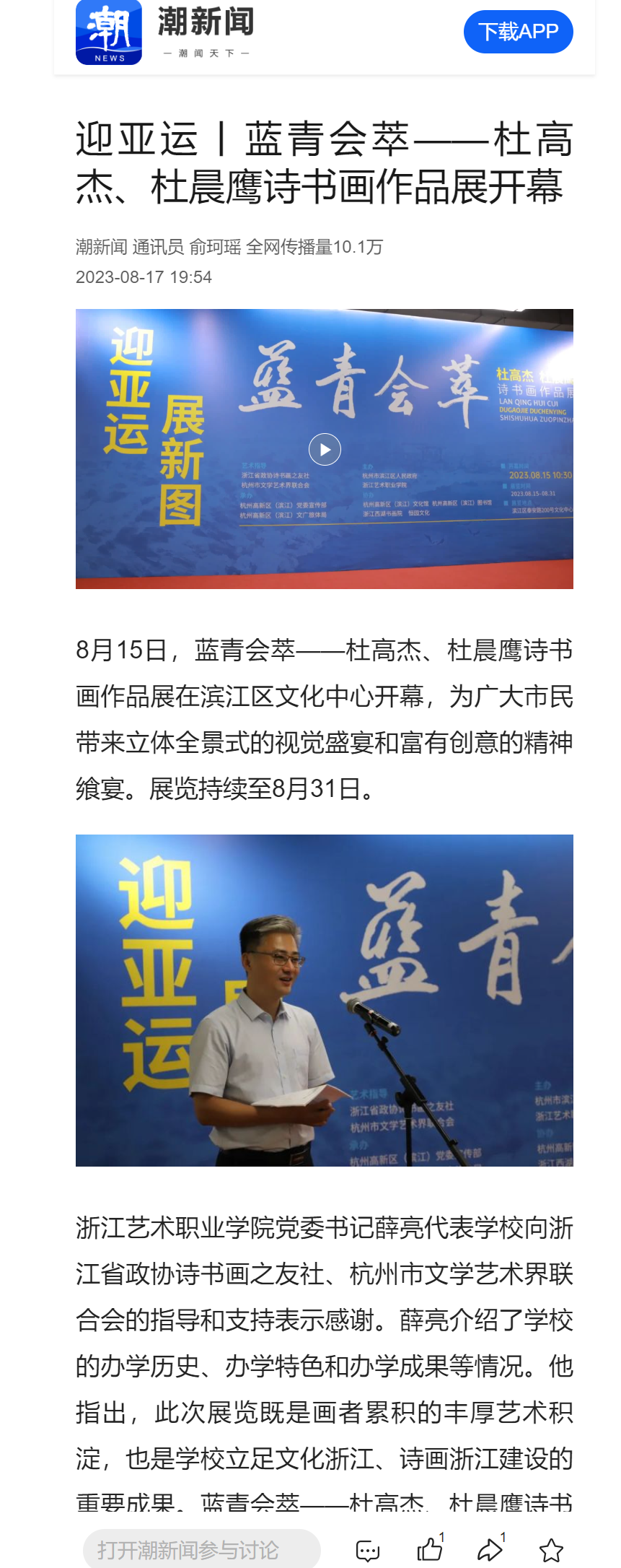 潮新闻:迎亚运丨蓝青会萃——杜高杰、杜晨鹰诗书画作品展开幕