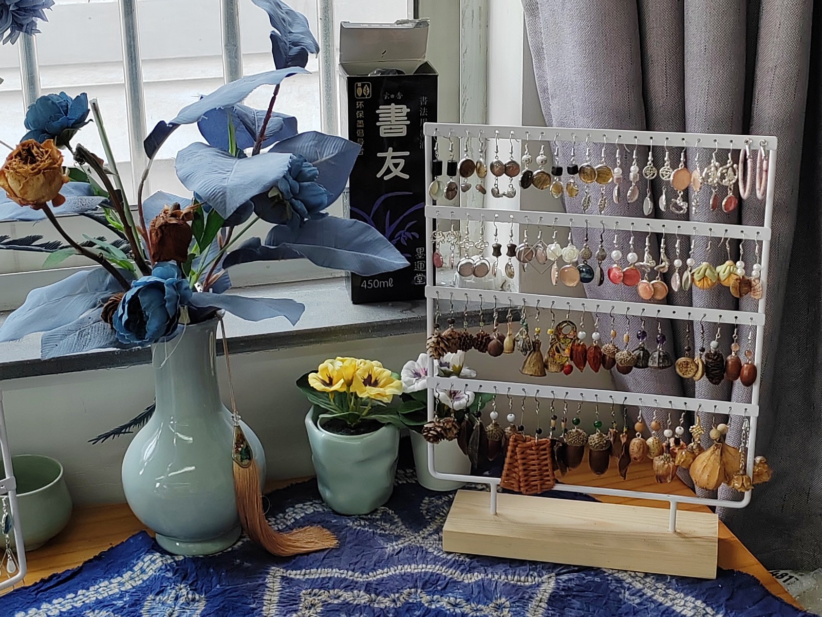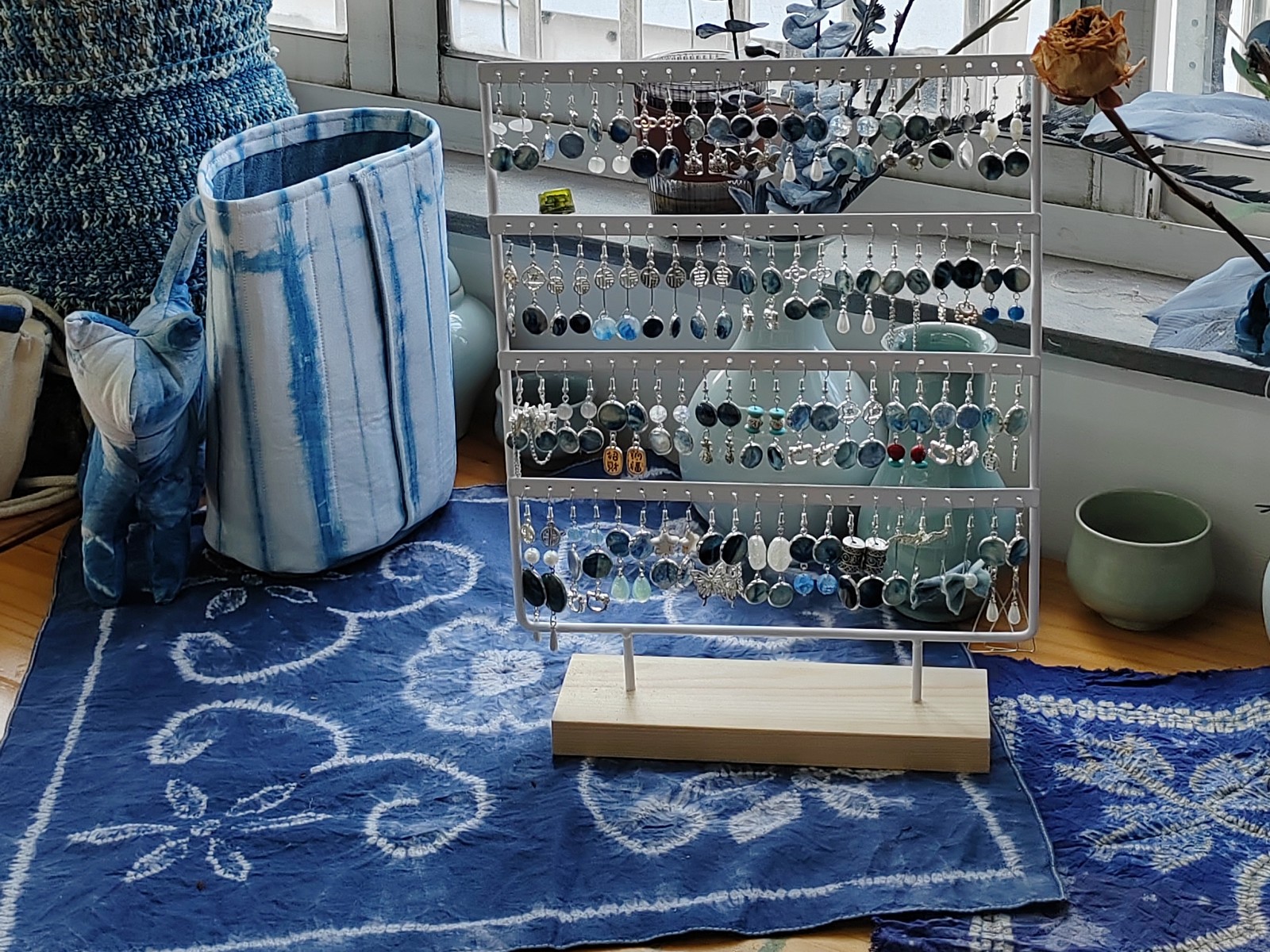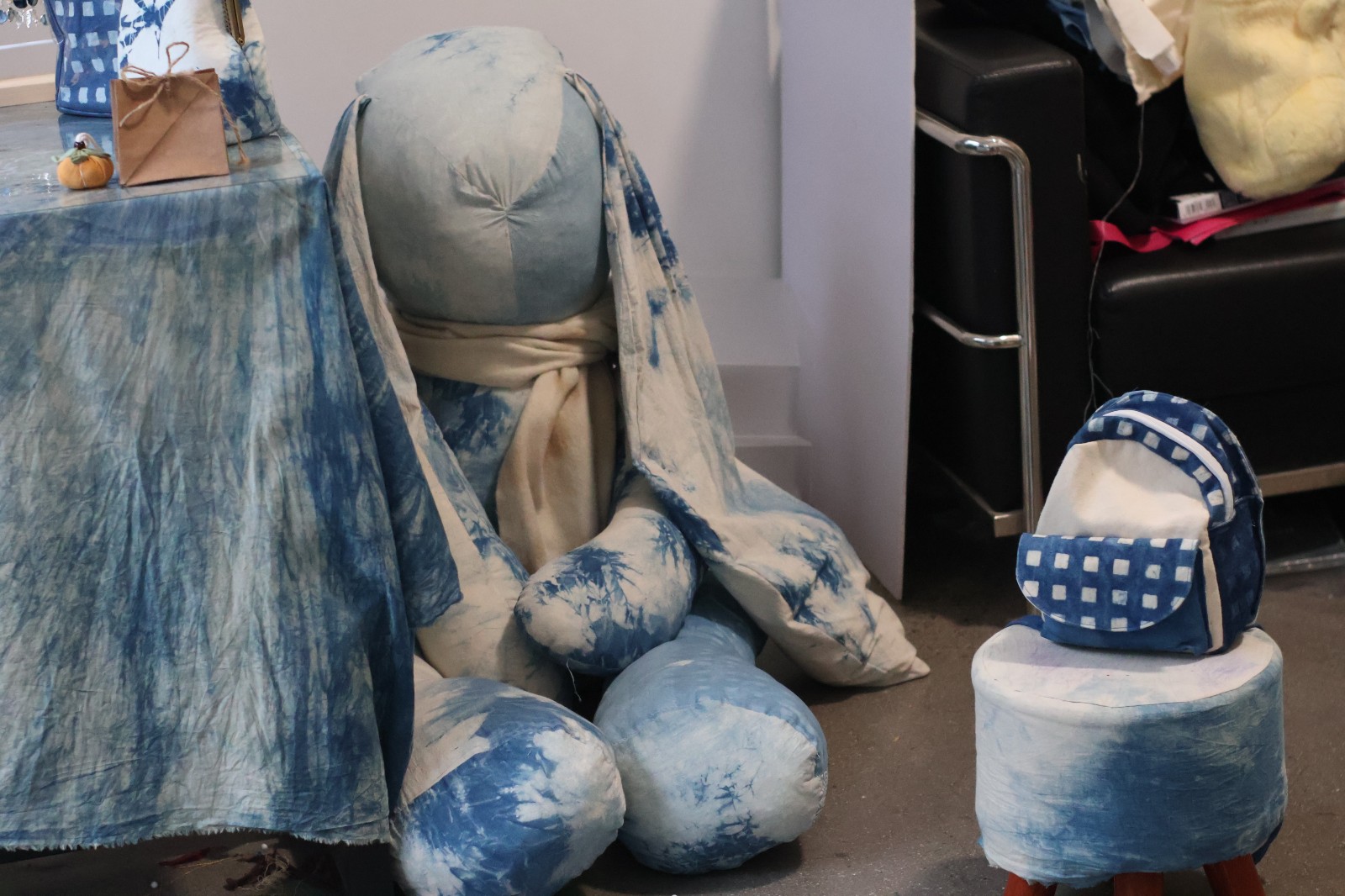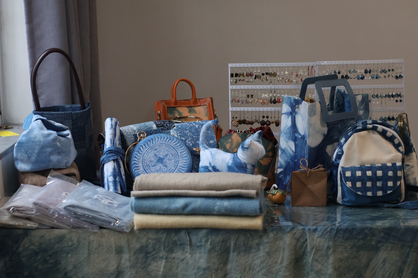 集市上,摊位热闹非凡,商品琳琅满目。手工艺学院民族传统技艺专业的师生团队紧扣课程体系,以独特的创意打造了别具特色的传统手工艺品,蓝染挂件、饰品、年历和植物染围巾被周边社区居民反复称赞。