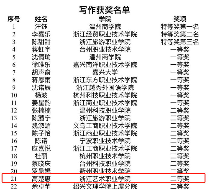 与其他赛事不同,本次写作大赛采用了线上评比的模式,除了专业技能上的指导,指导老师还为本次比赛的场地的布置、设施的调试做了充分准备,为参赛同学提供了坚实的保障。本次比赛备赛时间短、强度大,但两位参赛同学毫不畏惧,充分投入,强化训练;赛场上沉着冷静,发挥出色,充分展现了新时代浙艺学子的风采。