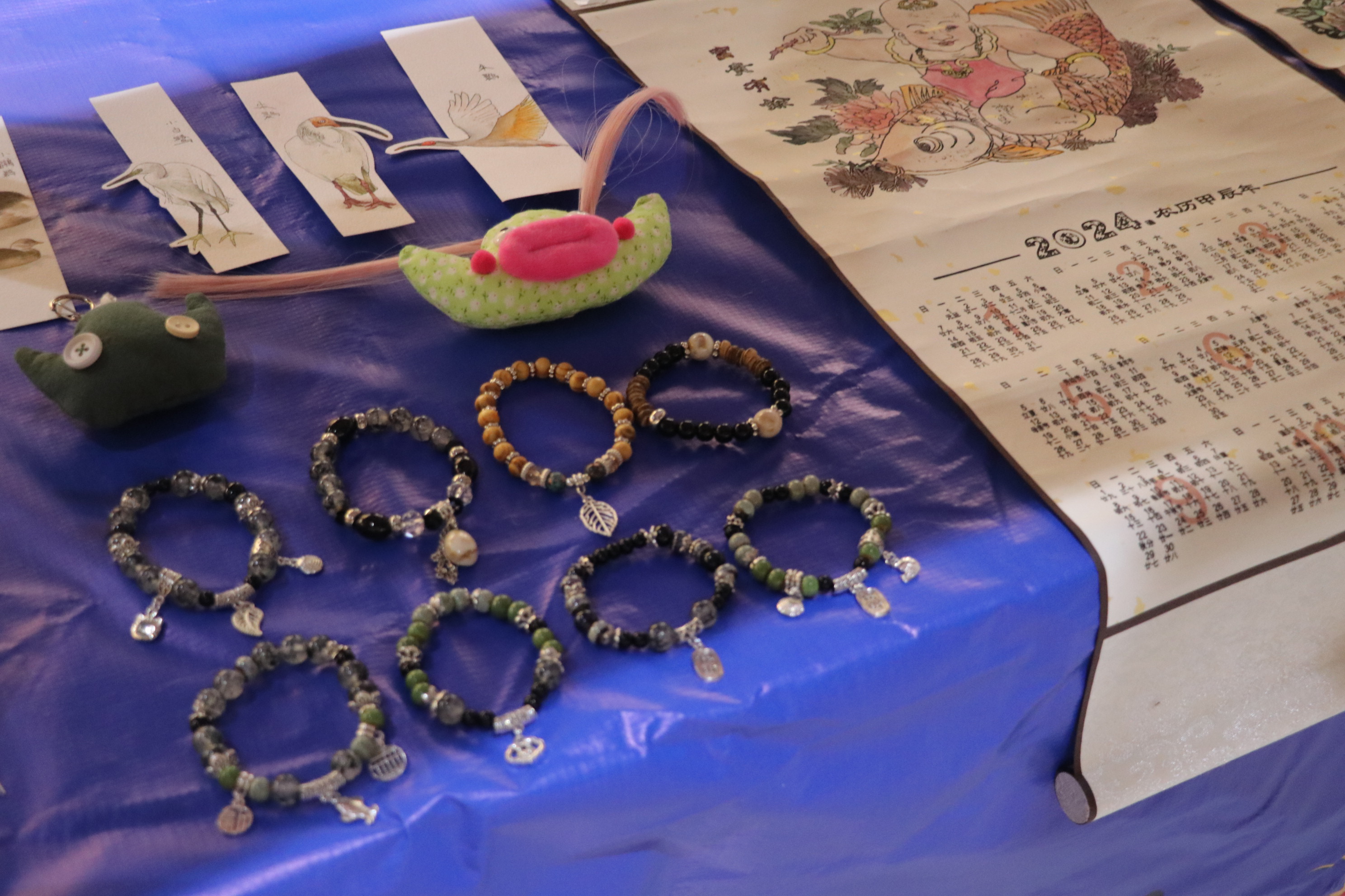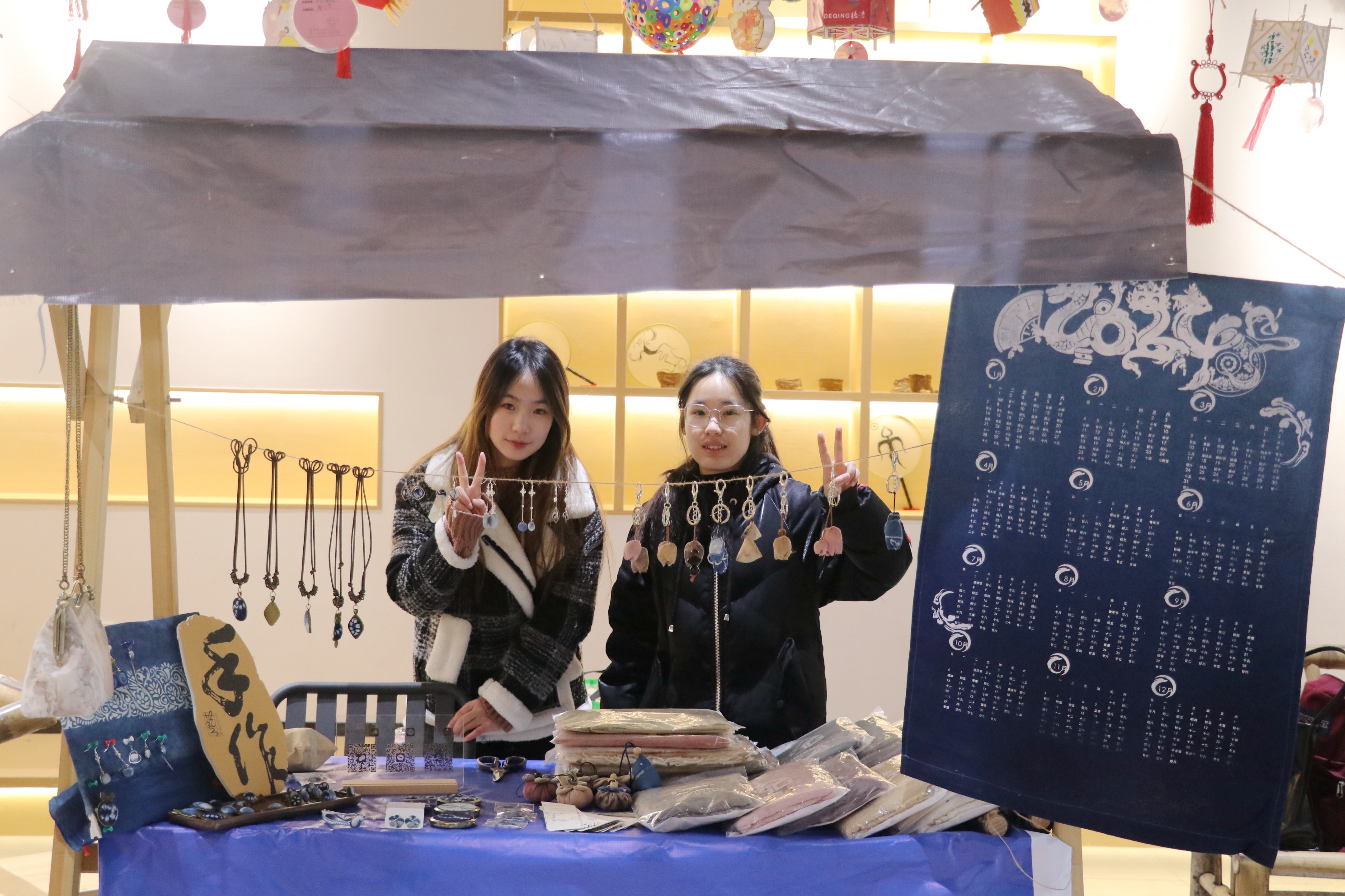活动当天,赏灯游园会区域,在手工艺学院学生们的摊位上,用草木染制作的围巾、饰品、蓝染年历、水印木刻挂历、竹编花灯、青瓷花口杯、手工手链、挂饰、书签……传统手工艺品琳琅满目,引得游客纷纷驻足。学生利用自身所学知识,在传统技艺的基础上融合新春、元宵的元素,充分推广传统手工艺的独特魅力,通过静态展陈和动态展演让古老手工艺焕发出新的生机,让游客近距离感受到非遗之美,体会别样的年味。