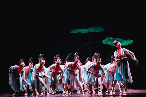 群舞《莲鼓乐歌行》源自唐代诗人李颀的名诗《采莲》,以古代越地江南人文生活画面为背景,塑造了一幅“西子湖畔十里荷花”的人间美境,展现了江南古典舞蹈的典型特征和中华美学的独特韵味。