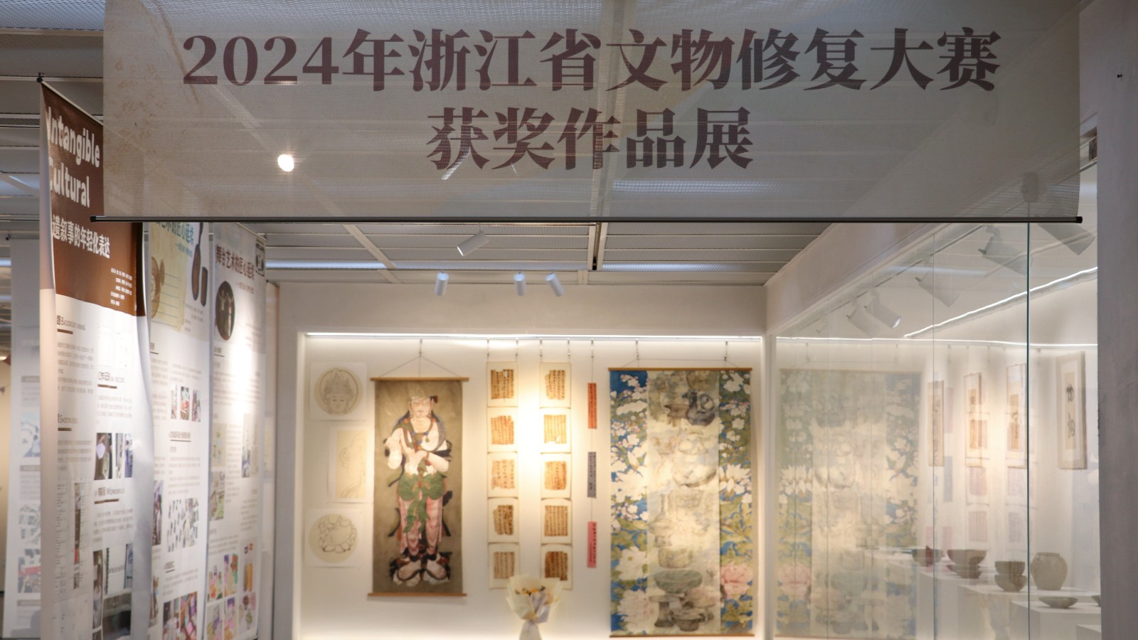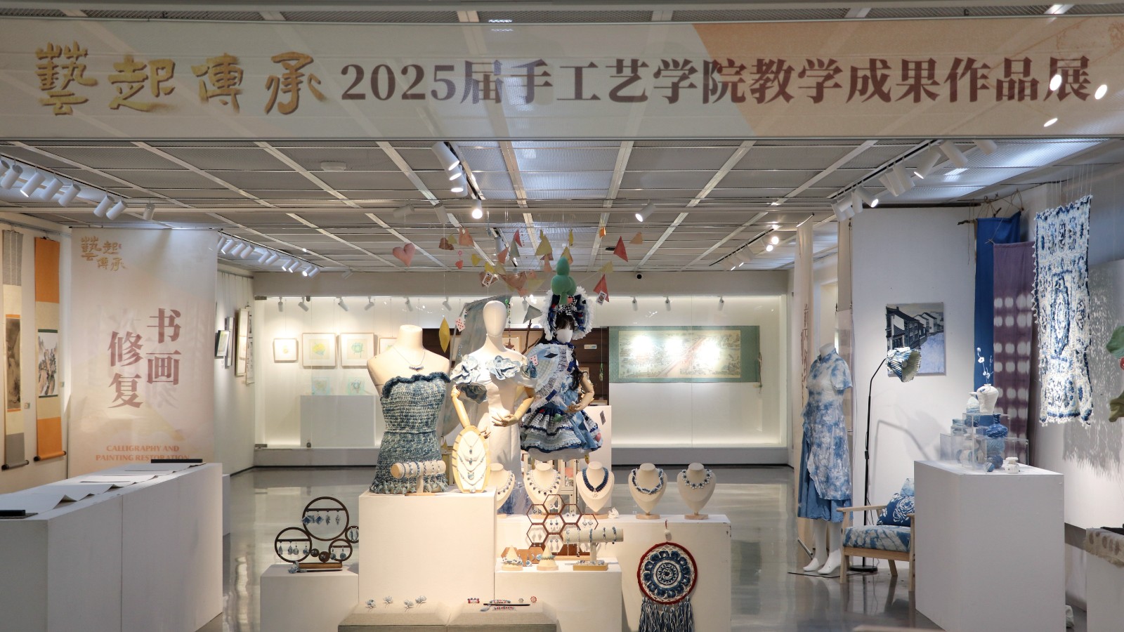 本届展览以“艺起传承”为主题,展示2025届手工艺学子在文物修复与保护、民族传统技艺、文化创意与策划、展示艺术设计四个专业的教学成果作品,书画装裱、古籍修复、陶瓷修复、古书画仿制、青瓷烧造、传统印染、水印木刻、刺绣工艺、博物插画、文创产品设计等多元艺术形式呈现。
