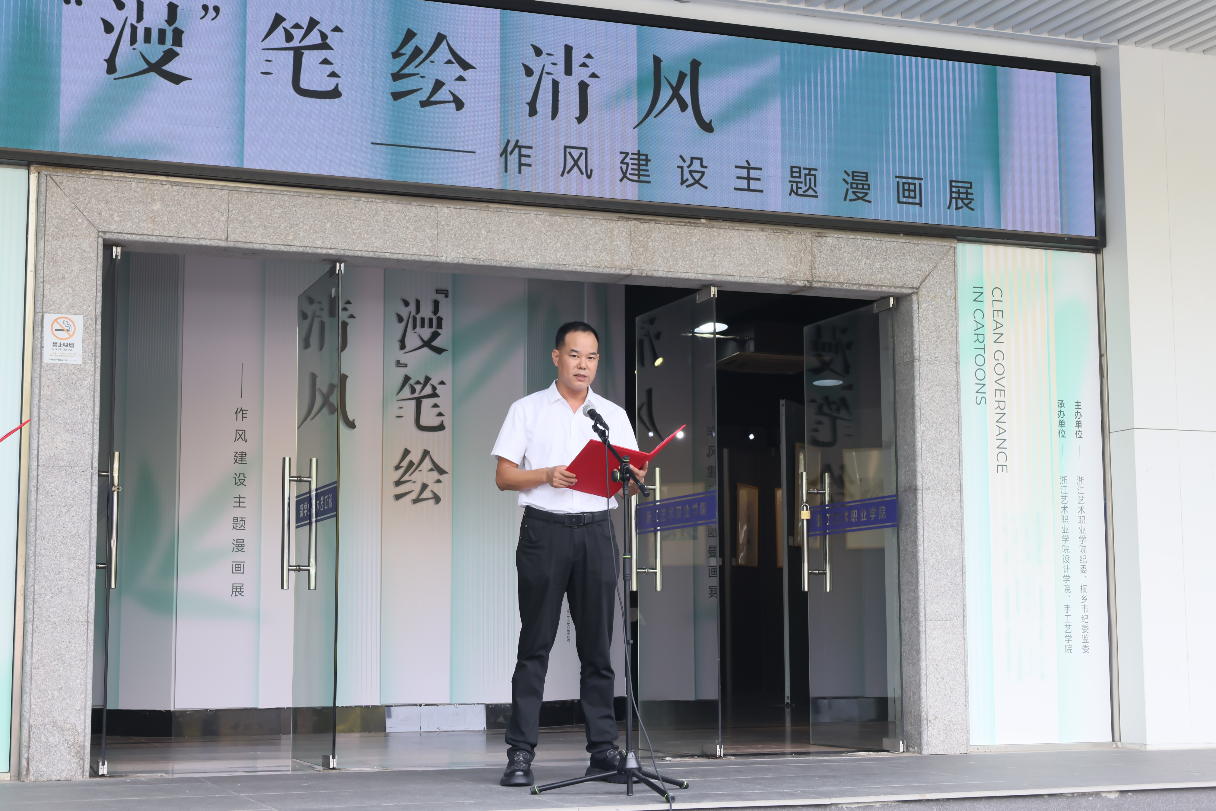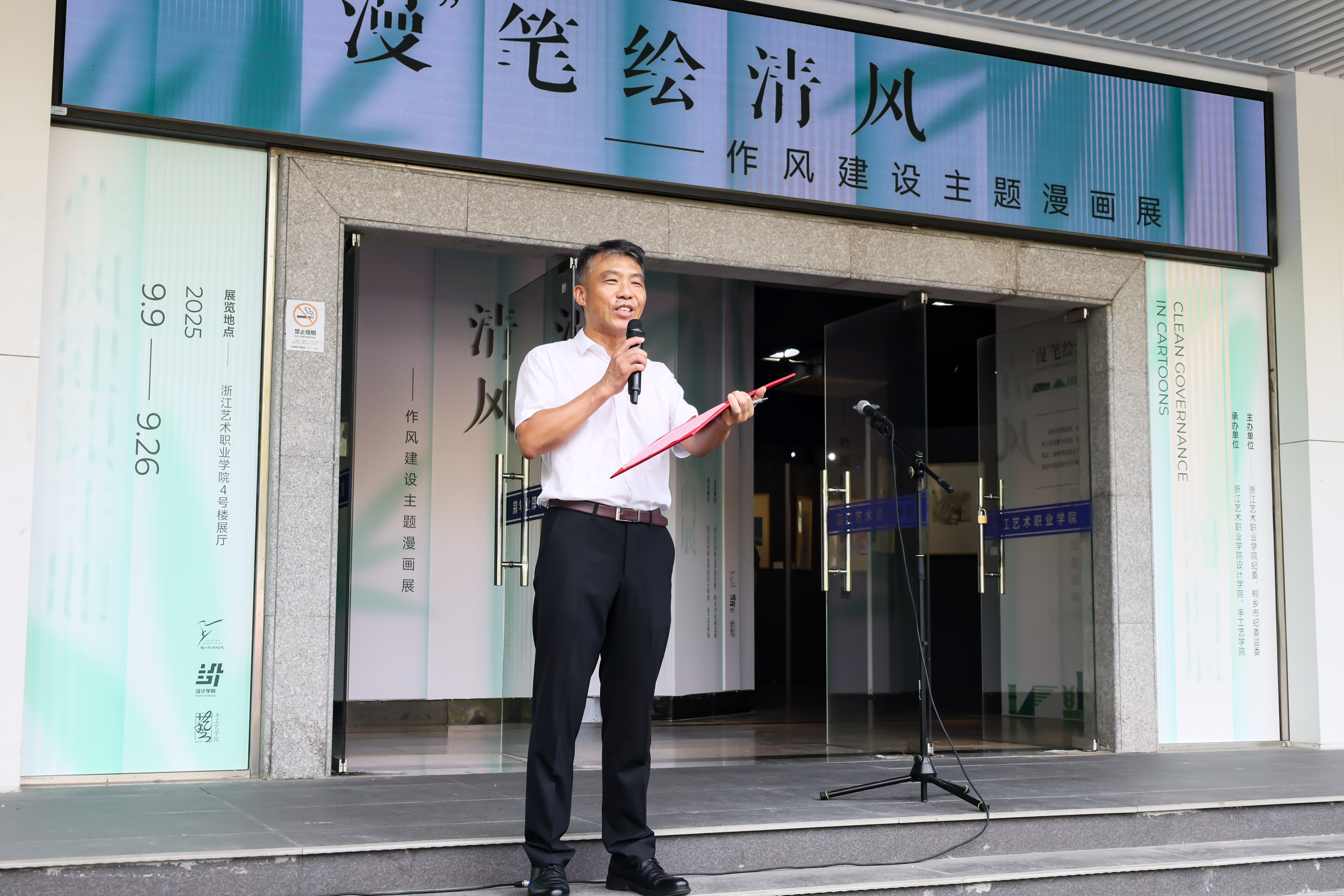 党委副书记夏开堂在致辞中强调,学校近年来持续推进新时代清廉校园建设,师生廉洁文化作品屡获佳绩,充分展现了学校廉洁教育的深厚积淀。此次与桐乡市纪委监委合作举办漫画展,是深化落实中央八项规定精神、加强作风建设的重要实践。他希望全校党员干部和教职工进一步坚定理想信念,坚守廉洁从教,争做担当作为的表率,共同为推动学校新一轮高质量发展贡献力量。